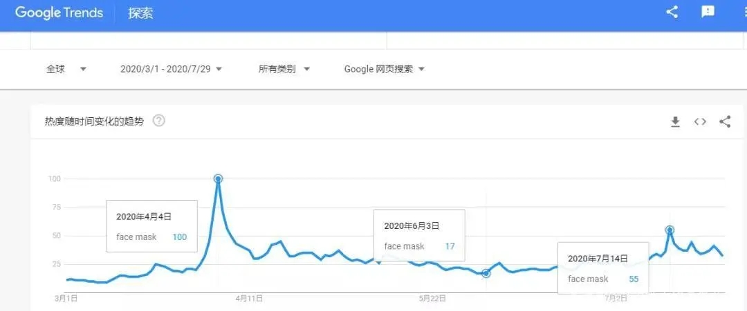 “face mask”的搜索量在4月4日達(dá)到高峰后,一直在低谷徘徊,7月又重新上漲。