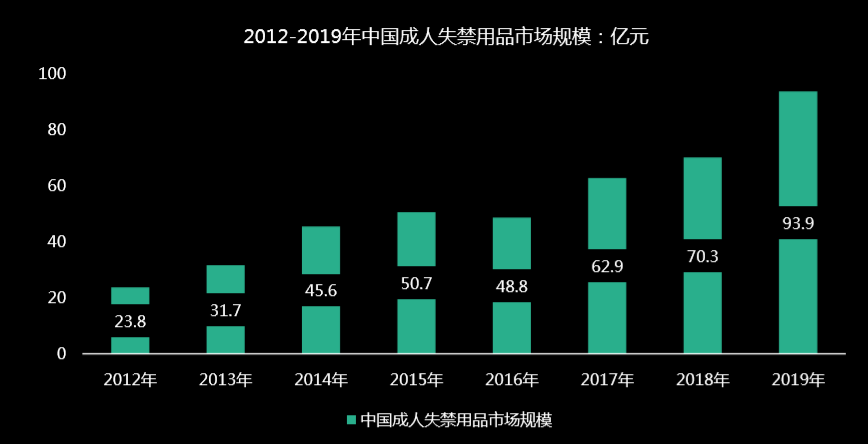 根據(jù)人口失禁發(fā)生率和人口結(jié)構(gòu)估算,中國失禁的人數(shù)在2-3億人,按照每人正常使用片單數(shù)去核算,這個(gè)群體的失禁用品規(guī)模應(yīng)該是現(xiàn)在實(shí)際的4-5倍(2019年中國成人失禁用品市場(chǎng)規(guī)模為93.9億元),這還是保守估算的結(jié)果。