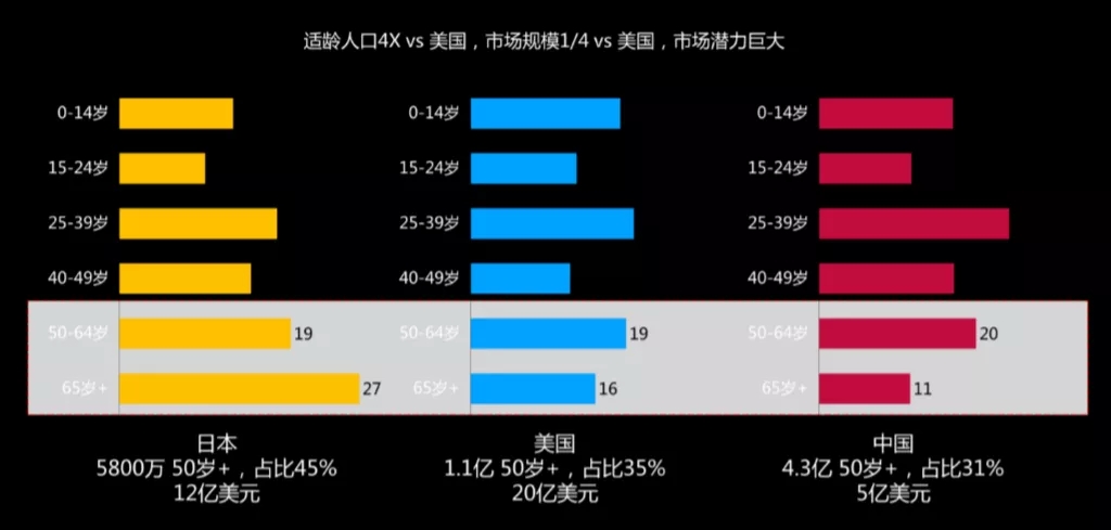 舉個(gè)例子,2017年中國50+人口是4.3億人,是美國同年50+人口的4倍(美國為1.1億),但是2017年中國中老年護(hù)理行業(yè)市場(chǎng)規(guī)模為5億美元,美國為20億美元。中國還有多大的市場(chǎng)潛力沒有釋放出來?