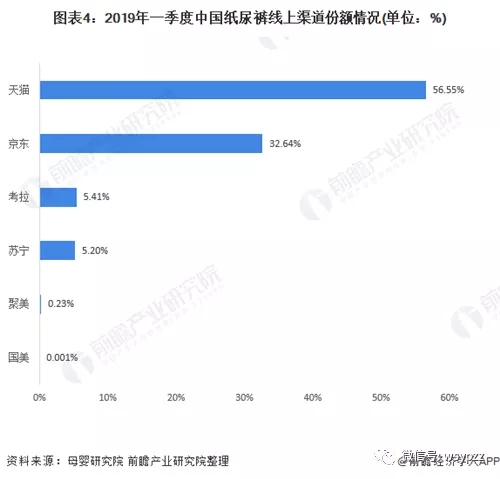 可見,線上渠道是紙尿褲銷售的重要渠道。2019年第一季度,紙尿褲銷售額達(dá)48.1億元,同比增長12.6%。其中天貓平臺保持其“一哥”優(yōu)勢,銷售額27.2億元,占比56.5%。京東平臺銷售額15.7億元,占比32.6%,同比增長6.1%。在增長率上,考拉出現(xiàn)了20.2%的負(fù)增長,蘇寧實(shí)現(xiàn)了214.8%的超高速增長。