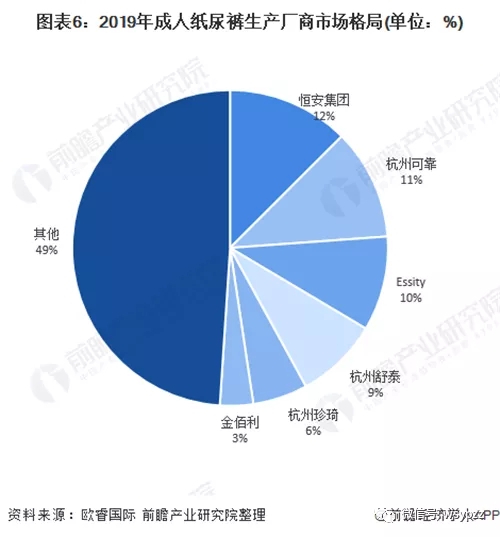 在成人紙尿褲生產(chǎn)廠商中,恒安集團(tuán)、杭州可靠、Essity市場份額超過10%。排名前六的成人紙尿褲生產(chǎn)廠商市場份額為51.04%,市場集中度相對較高,生產(chǎn)廠商之間市場份額沒有拉開明顯的差距,市場競爭相對激烈。