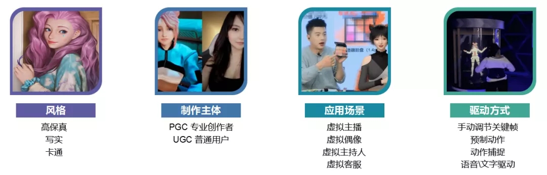 對(duì)于虛擬人的技術(shù)分類,我們可以從風(fēng)格、創(chuàng)作主體、應(yīng)用場景、驅(qū)動(dòng)方式幾個(gè)方面進(jìn)行了解: