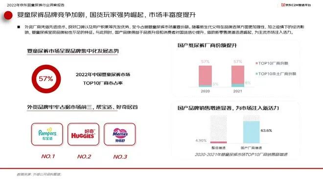 面對(duì)市場(chǎng)空間的變化,國(guó)內(nèi)嬰童尿褲品牌競(jìng)爭(zhēng)加劇。其中外資廠商憑借先進(jìn)技術(shù)、良好口碑以及用戶(hù)積累等先發(fā)優(yōu)勢(shì),至今占據(jù)嬰童尿褲市場(chǎng)重要份額。而一方面,隨者新生代父母在品牌選擇方面更加理性,加之疫情下的經(jīng)濟(jì)影響,嬰單尿褲也呈現(xiàn)出品牌粘性不足的特征。與此同時(shí),得益于品質(zhì)升級(jí)和消費(fèi)者對(duì)國(guó)貨信心的提升,國(guó)貨品牌借助新零售渠道迅速崛起,為主流市場(chǎng)注入活力。報(bào)告顯示,本土頭部廠商份額從2020年的5%迅速提升至2021年的8%,而國(guó)產(chǎn)廠商銷(xiāo)售額年增速則達(dá)到63.6%,遠(yuǎn)超行業(yè)整體增速的4.9%。