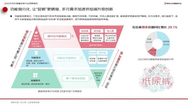 在產(chǎn)品細(xì)分賽道方面,功能和場(chǎng)景細(xì)分、個(gè)性化體驗(yàn)成為未來(lái)市場(chǎng)發(fā)展新動(dòng)能。圍繞不同場(chǎng)景、不同功能、不同人群創(chuàng)新擴(kuò)容,能夠更好地滿(mǎn)足用戶(hù)精細(xì)、多元化的需求。細(xì)分品類(lèi)下,適用于大齡寶寶運(yùn)動(dòng)和穿脫自由的“拉拉褲”關(guān)注度顯著提升,成為高端尿褲領(lǐng)域里的趨勢(shì)單品。報(bào)告顯示,2022年8月,“拉拉褲”關(guān)鍵詞搜索份額同比提升29.1%。讓“屁糧"更精細(xì),多元需求加速供給端升級(jí)創(chuàng)新。