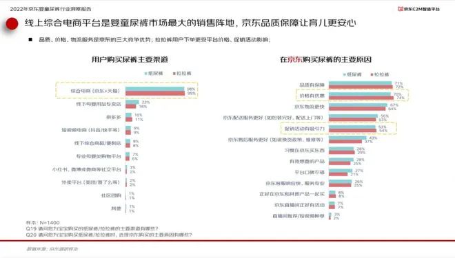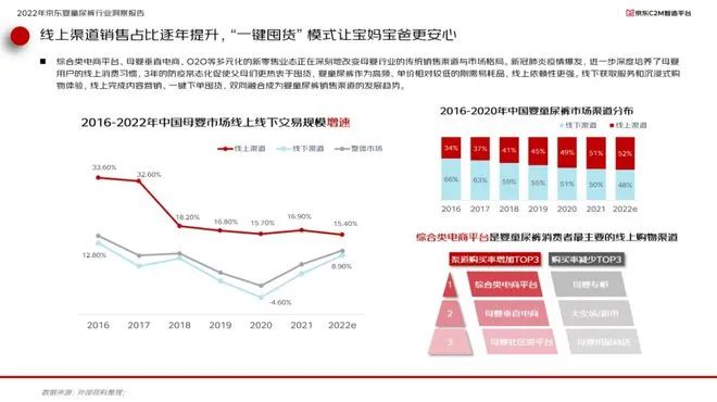 報(bào)告顯示,2022年中國(guó)嬰童尿褲市場(chǎng)渠道分布上,線上渠道占比已經(jīng)超過(guò)線下渠道達(dá)到52%,而以京東為代表的綜合類(lèi)電商是嬰童尿褲消費(fèi)者最主要的線上購(gòu)物渠道。