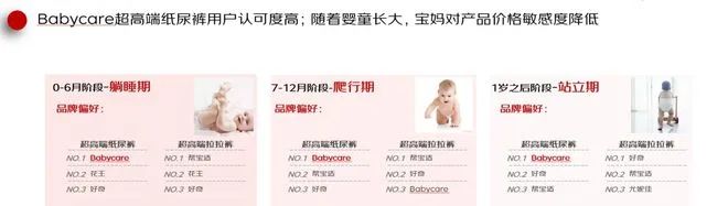 報(bào)告還對(duì)國(guó)產(chǎn)母嬰用品品牌Babycare進(jìn)行了解析,發(fā)現(xiàn)該品牌的超高端紙尿褲用戶(hù)認(rèn)可度高,無(wú)論是0-6個(gè)月,還是7-12個(gè)月,以及1歲之后階段,Babycare超高端紙尿褲都是用戶(hù)品牌偏好榜首。而且隨著嬰童長(zhǎng)大,寶媽對(duì)產(chǎn)品價(jià)格敏感度降低,Babycare超高端紙尿褲成為了諸多寶媽的首選產(chǎn)品。