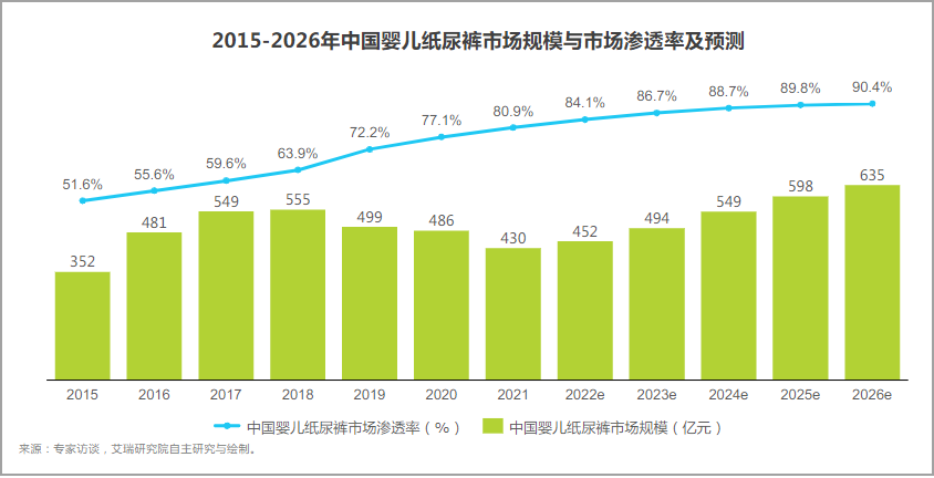以嬰兒紙尿褲市場為例,該品類的市場滲透率從2015年的51.6%增加到2022年的84.1%,預(yù)計到2026將升至90.4%。