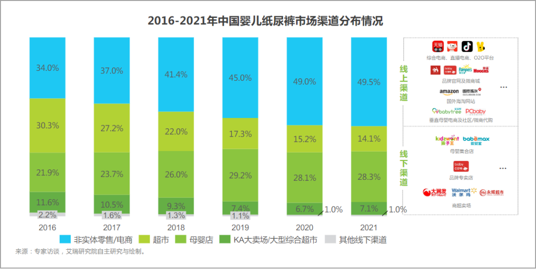 同樣以紙尿褲為例。來自艾瑞咨詢數(shù)據(jù)顯示,2021年嬰兒紙尿褲市場線上渠道占比達49.5%,超過母嬰店的28.3%和超市的14.1%。
