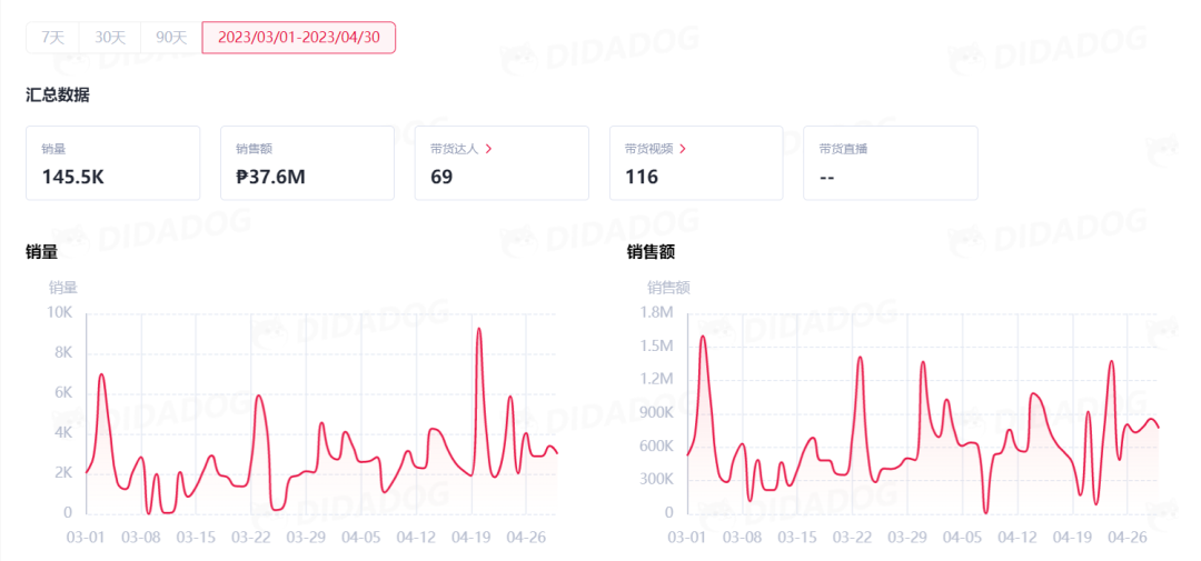品牌Unilove在3-4月之間銷量為145.5K,銷售額為?37.6M(736.96K美金),其中,在TikTok的帶貨達人有69位,帶貨視頻有116個。在4-20單日銷量達到了9.6K,在3-3單日銷售額達到?1.6M(31.36K美金)。