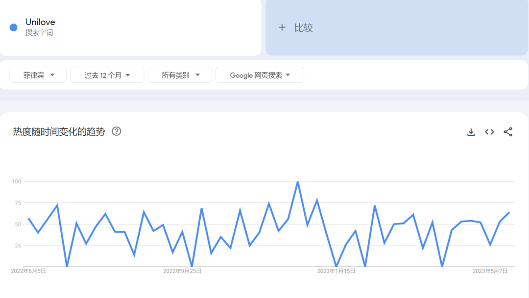 通過Google Trends我們可以了解到一定時期內,產(chǎn)品關鍵詞在搜索引擎上的搜索熱度和市場趨勢。從下方搜索趨勢不難看出,菲律賓地區(qū)在2022年全年關于“unilove”的搜索熱度平穩(wěn),并且在2023年3-4月有上升趨勢,從搜索趨勢上可以看出,unilove在菲律賓市場形成了穩(wěn)定的品牌曝光。