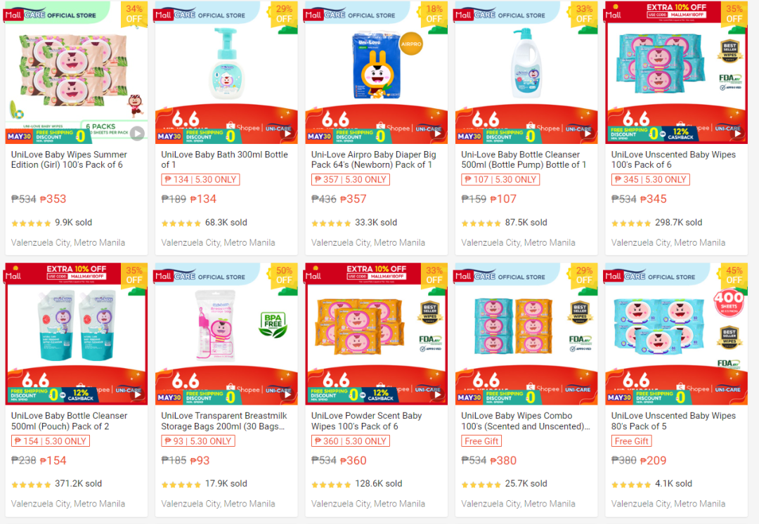 由于該品牌入局較早,有了一定的粉絲基礎,以及品牌影響力,所以在shopee和TikTok Shop平臺銷量可觀,品牌將旗下的產(chǎn)品分割成不同的子品牌,便于寶媽消費者查看用品,而shopee站點的首頁可以發(fā)現(xiàn),該品牌目前推出多種活動,并且近期正在準備shopee的6.6大促。