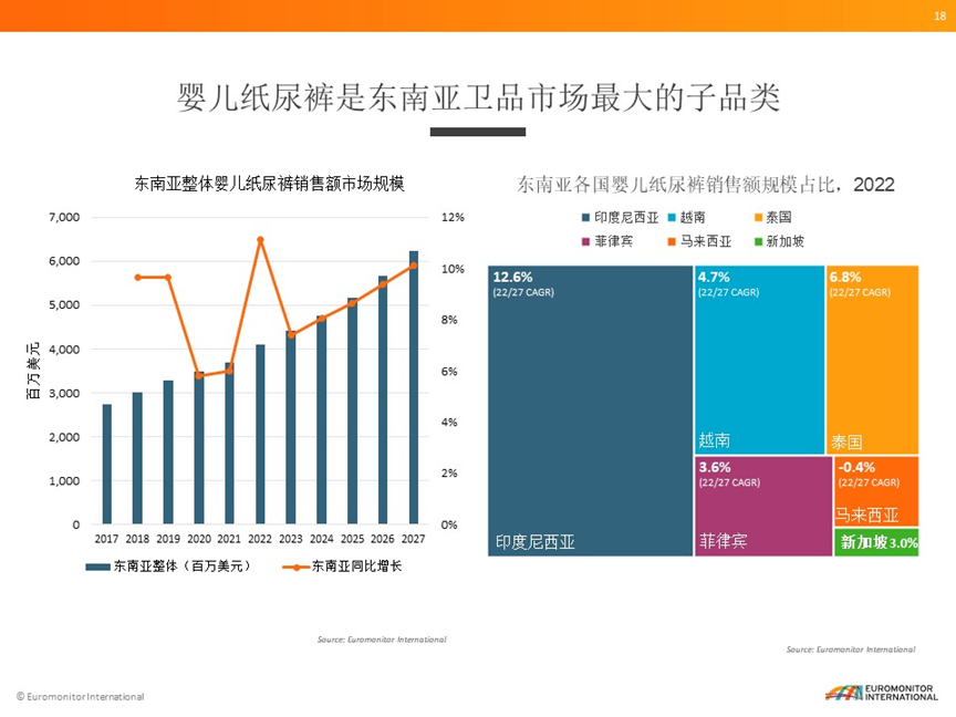 眾多紙尿褲品牌對東南亞市場情有獨(dú)鐘背后,是可觀的市場前景。根據(jù)Euromonitor(歐睿信息咨詢)數(shù)據(jù)顯示,2022年東南亞一次性衛(wèi)品市場整體零售額達(dá)到了65億美元,其中嬰兒紙尿褲是東南亞衛(wèi)品市場最大的子品類,去年市場規(guī)模超過了40億美元,21-22年同比增長達(dá)到將近11%。預(yù)計(jì)2027年嬰兒紙尿褲市場會(huì)超過60億美元。